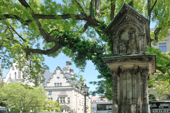 In 1840 the then Gewandhaus-Kapellmeister and composer Felix Mendelssohn Bartholdy inspired the creation of a memorial for the composer colleague from Eisenach, and the Leipzig painter, Eduard Bendemann, made a first draft. His colleagues, Ernst Rietschel and Julius Hübner, developed this first draft and finally Hermann Knaur created it. The material is Elbsandstein and probably for this reason the monument had to be restored several times, the last time in 2005. Where it is today, it was then inaugurated three years after the first planning. This place was directly behind the Old Thomasschule some 170 years ago - Bach lived with his family in this house. In 1902 this Old School was unfortunately demolished.