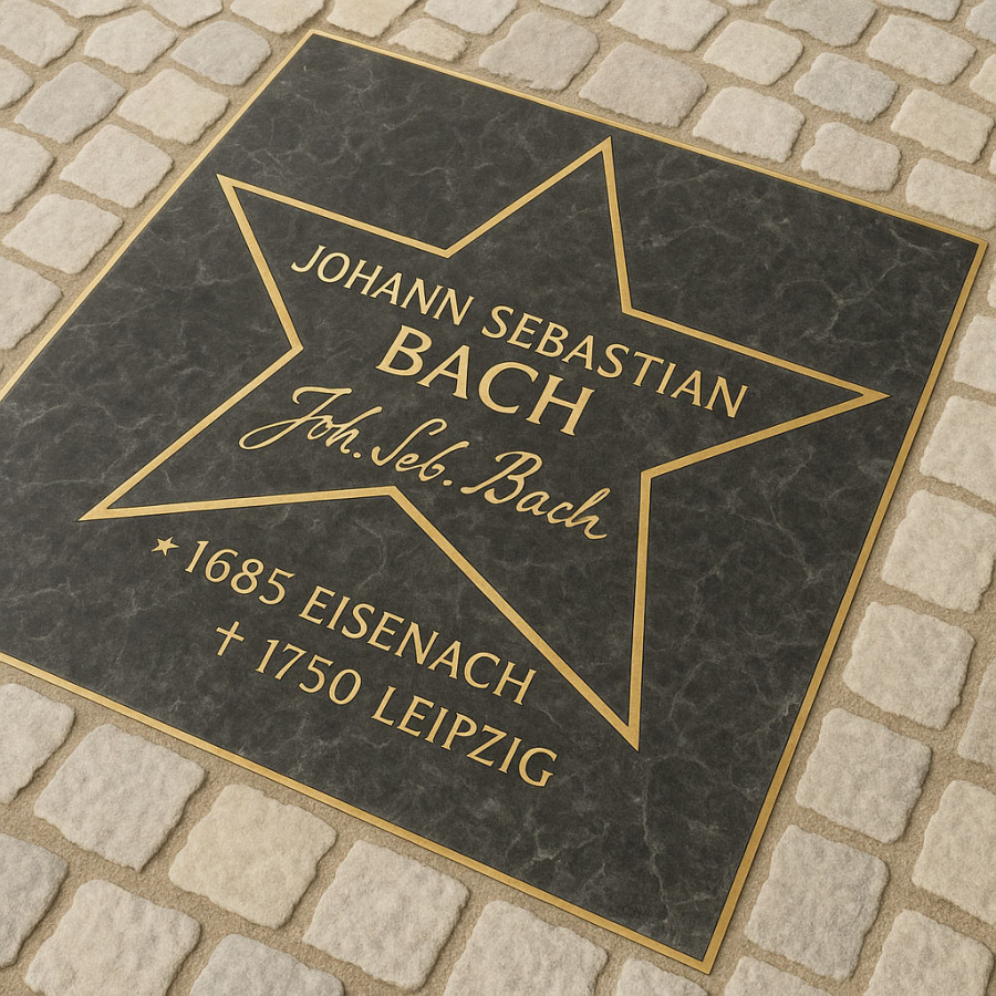 No, it’s not the authentic star. Because there simply isn’t a good photo of it. And poor-quality photos just aren’t acceptable … not in my project. So a little photo montage of my own, which comes very, very close to the artwork in Vienna, is a better fit. It will then remind us for all eternity that Bach was surely the musician who waited the longest for “his star in Vienna.” Namely, from 1750 until June 11, 2003. Of course, this comparison isn’t entirely fair, since Bach was the first of the honored musicians, and therefore also the longest dead. Here, on “Bach on Bach”, he will not be removed again. We don’t do that. And in fact, this makes it Bach Monument No. 61. © Peter Bach, Jr.